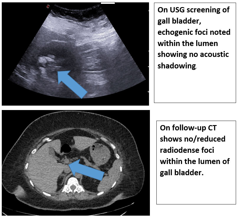 CT may demonstrable hyperdense material within the gall bladder due to calcium content.