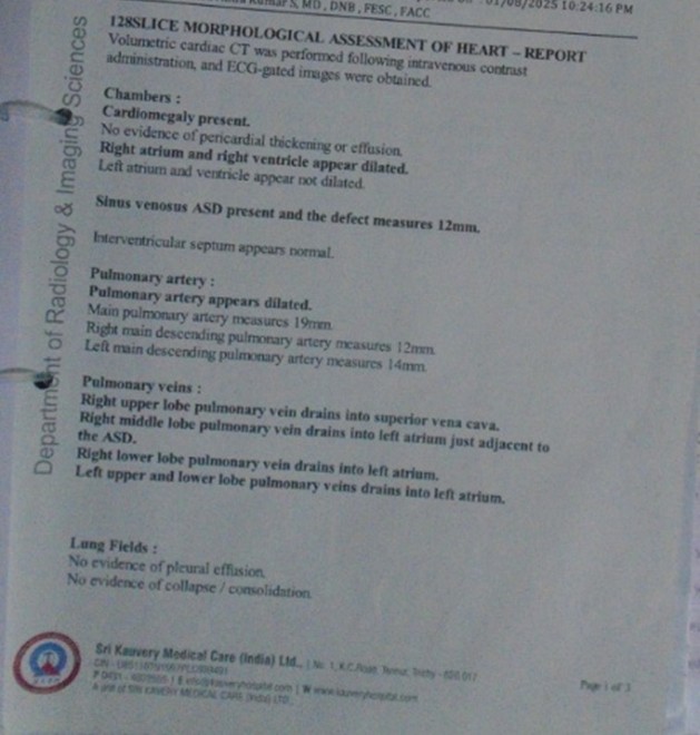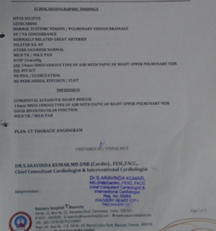 8 years aged boy had vomiting following outside food intake for which boy was taken to an outside hospital. He was diagnosed with Acyanotic congenital heart disease – ASD with Partial Anomalous Pulmonary Venous Connection (PAPVC). In view of the above findings, the patient was advised ASD surgical closure with rerouting of PAPVC.