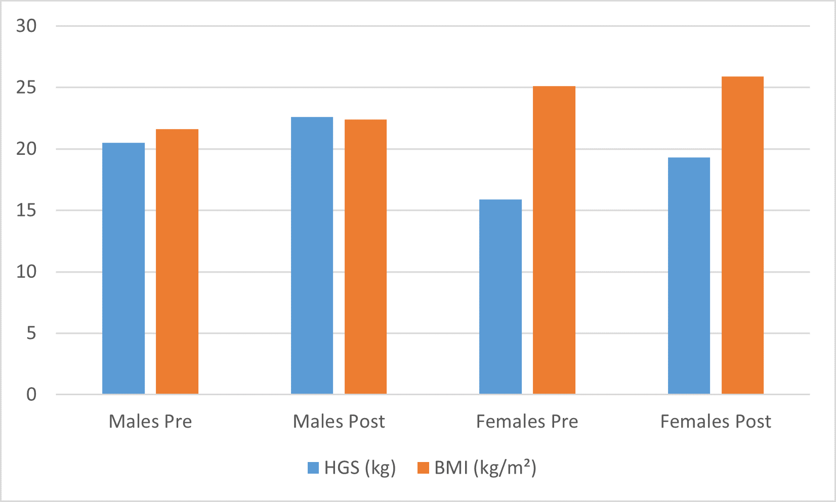 Fig (1): HGS Change by Sex (bar graph: pre/post means).