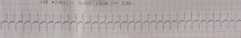 Three hours after admission, the child developed again tachycardia (HR >270/min) with poor peripheral and central pulse. There was ventricular tachycardia on ECG. Repeat shock with 4J/kg was given under sedation, there was transient sinus rhythm for 15 seconds, then reverted back to VT, 6J /kg shock was given, VT reverted to SVT. Recovery was associated with poor GCS and gasping efforts. Infant was intubated and started on IMV, CVC secured. He was also given one more esmolol bolus followed by trial of Inj. Lignocaine and Inj. MgSO4. However, there was no response. As central pulses were feeble he was started on adrenaline infusion. NG tube was inserted and one dose of propranolol and ivabradine were administered.