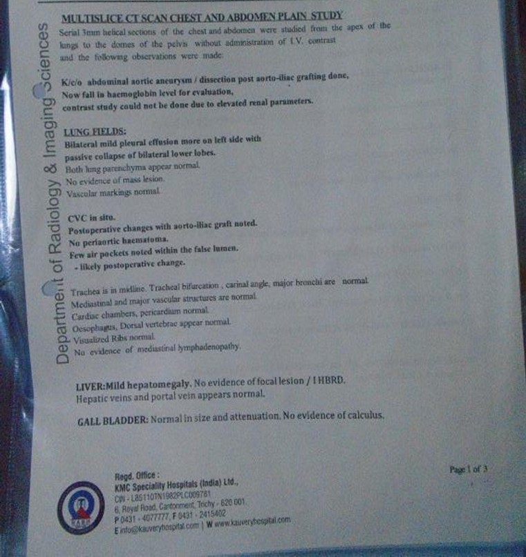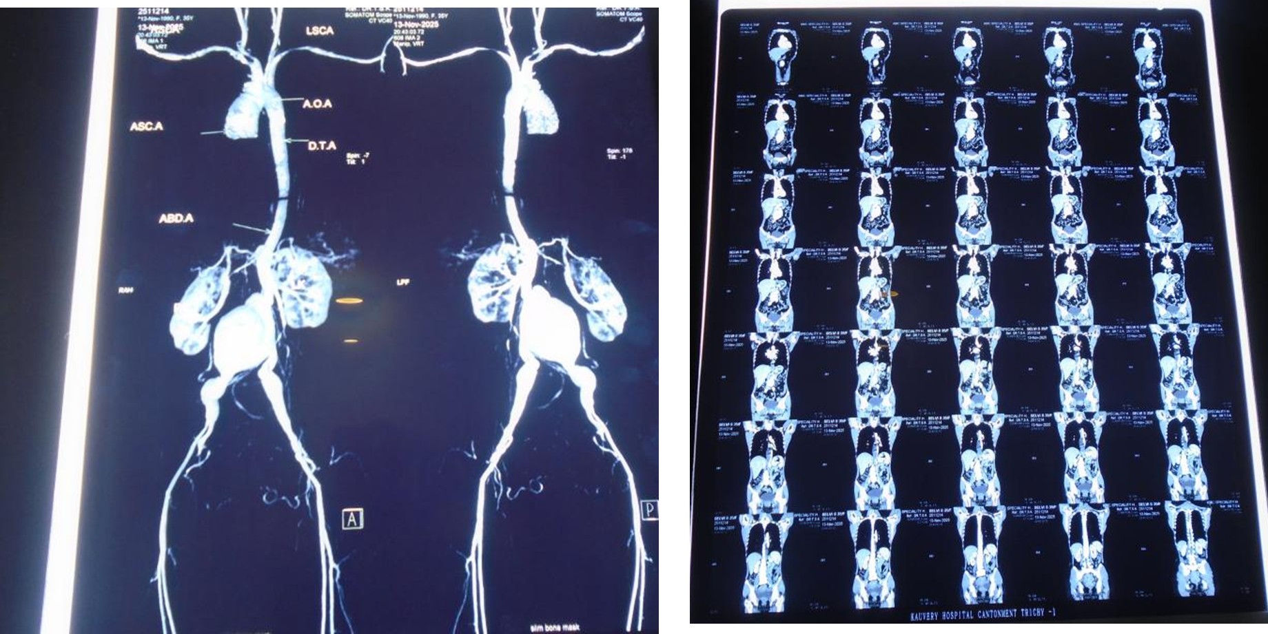 A 39 years old Female, known case of hypothyroidism for 10 years, complaints of sudden onset of pain abdomen since 04/11/2025and was evaluated further management in outside hospital, during her admission patient had episode of vomiting and increased abdominal pain for which CT Angio have been done which showed descending thoracic aorta and abdominal aortic aneurysmal dilation with dissection with aneurysm extending into right CIA. Patient was sent home for conservative management where she developed vomiting again and went to Meenakshi hospital where initial treatment has been given and referred here for further management. On receiving, patient was conscious, oriented and her vitals were stable. CT abdomen done showed DTA aneurysm with dissection infrarenal aortic aneurysm extending up to CIA? Mycotic origin. The patient admitted and planned for staged repair of TAAA. Cardiologist opinion was obtained and his orders were carried out. patient underwent Excision of infra-renal abdominal aneurysm with Aorta Bi-Iliac bypass using 18 × 9 mm unigraft.
