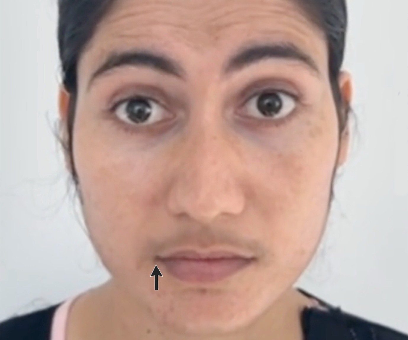 A woman with Bell’s palsy presented with a 1-month history of involuntary facial movements. Her face was nearly symmetric at rest, but when she raised her eyebrows, one side of her mouth involuntarily lifted (shown in a video).