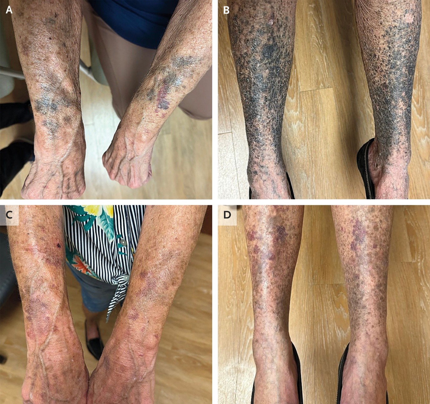 A 68-year-old woman with rosacea presented with a 6-week history of dark patches on the skin of her arms and legs. Two weeks before the onset of the skin changes, she had started taking minocycline daily.