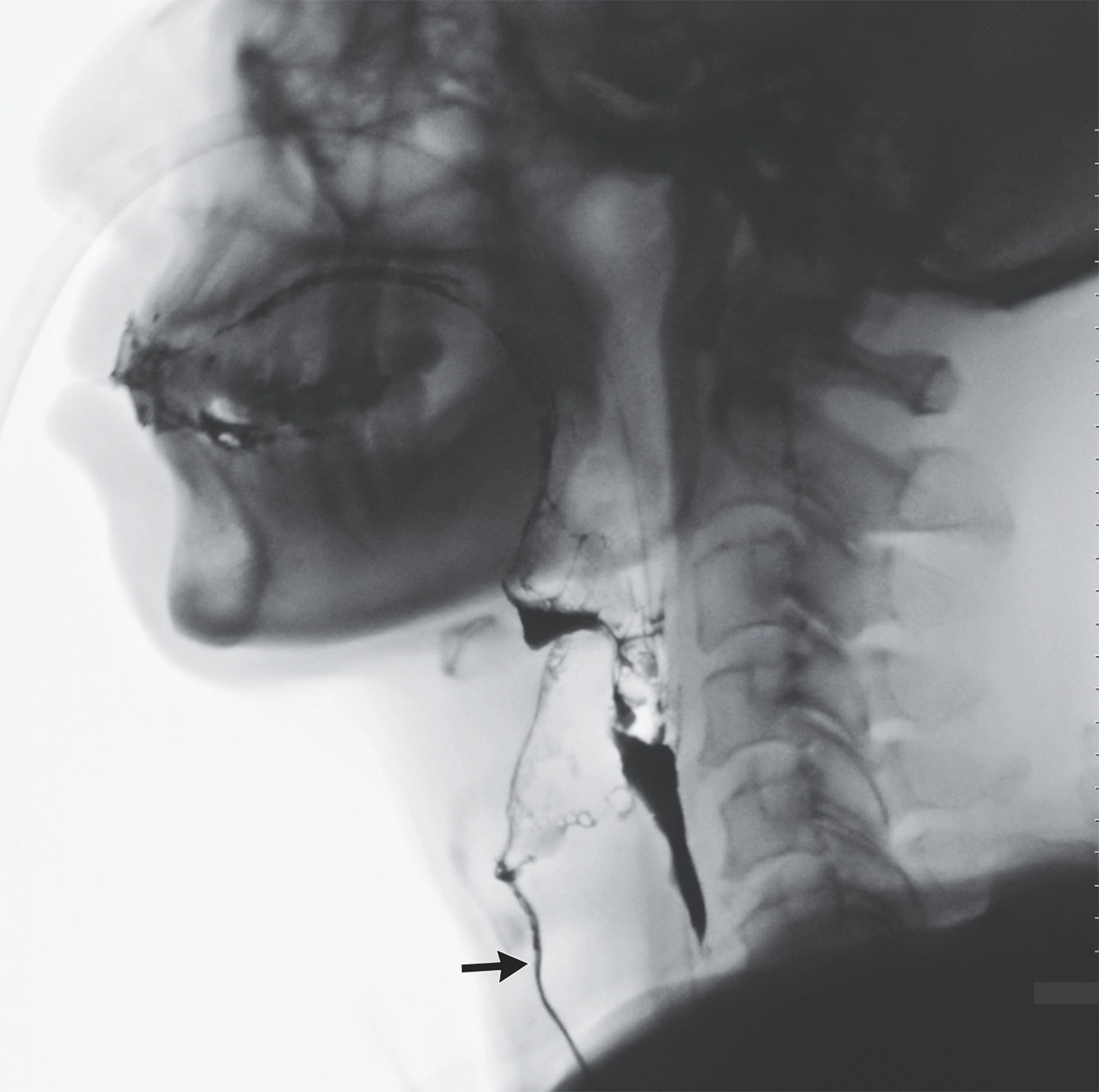 A 68-year-old man who had undergone intubation 25 days earlier had difficulty swallowing after extubation. A swallowing study showed fluid penetrating into the trachea without triggering a cough reflex