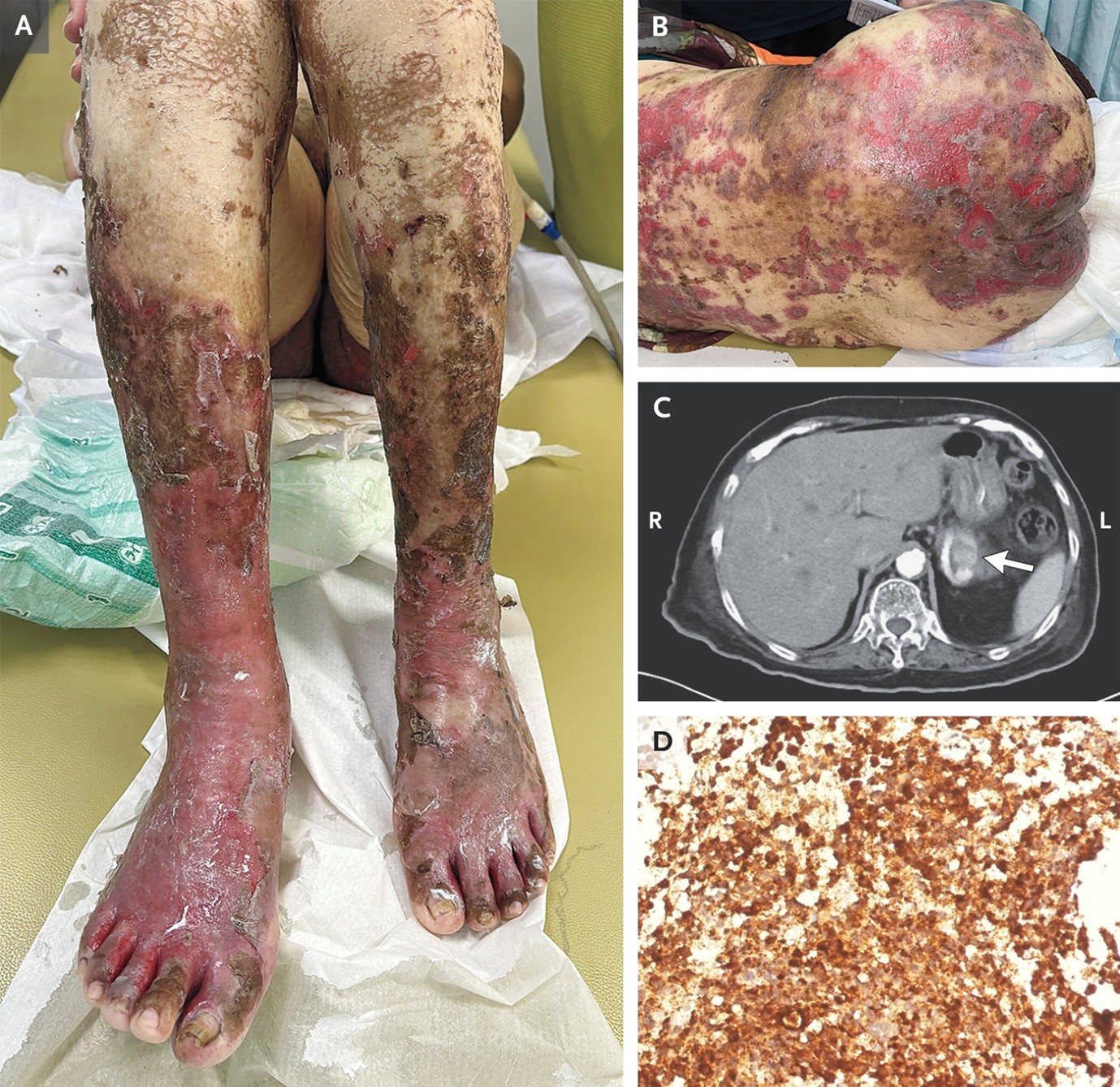 An 83-year-old woman with worsening type 2 diabetes presented with a 6-month history of painful rash. Hyperpigmented plaques with coalescing erosions and blisters were seen. Abdominal CT revealed a mass in the tail of the pancreas.