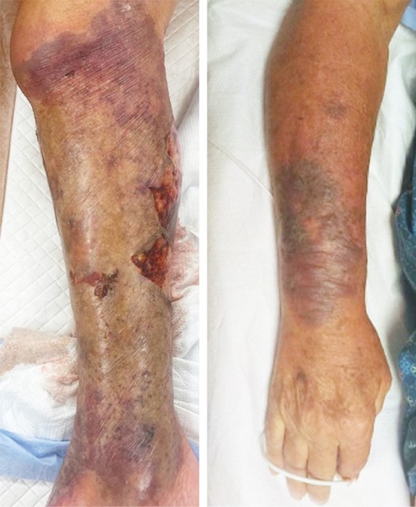 A 74-year-old man presented to the emergency department with a 3-day history of a painful laceration on his right leg that he had sustained while jumping into waters off the Gulf Coast of Florida. Two days after the injury to his leg, skin changes had appeared on his right arm. Physical examination is shown of the right lower leg and right forearm. He had no known history of chronic liver disease or an immunocompromising condition.