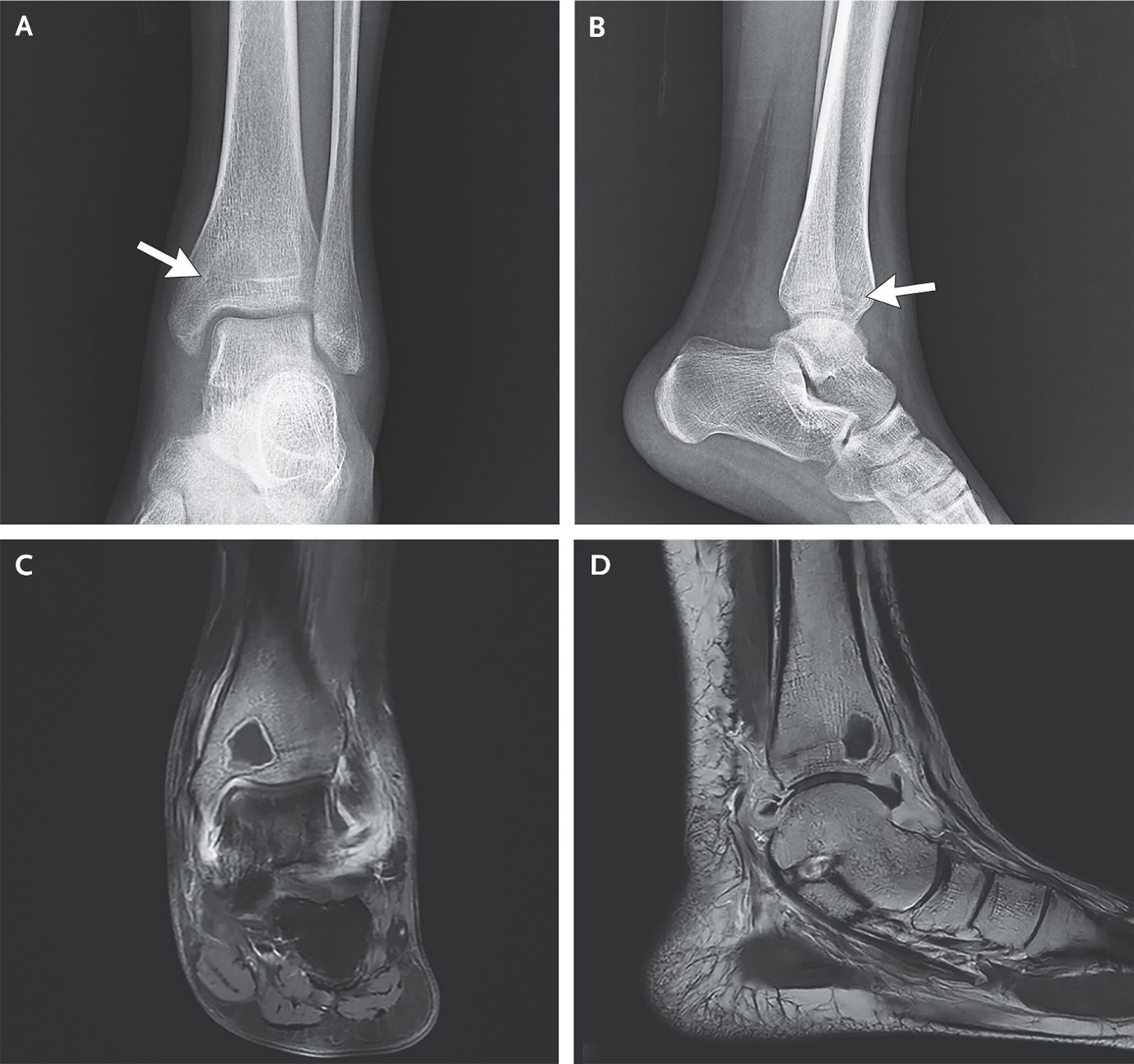 A 16-year-old girl presented with 1 month of ankle pain and 11 days of fever. Radiographs showed an ill-defined, radiolucent distal tibial lesion; on MRI, the lesion was hypointense and surrounded by a hyperintense sclerotic rim.