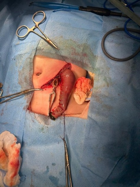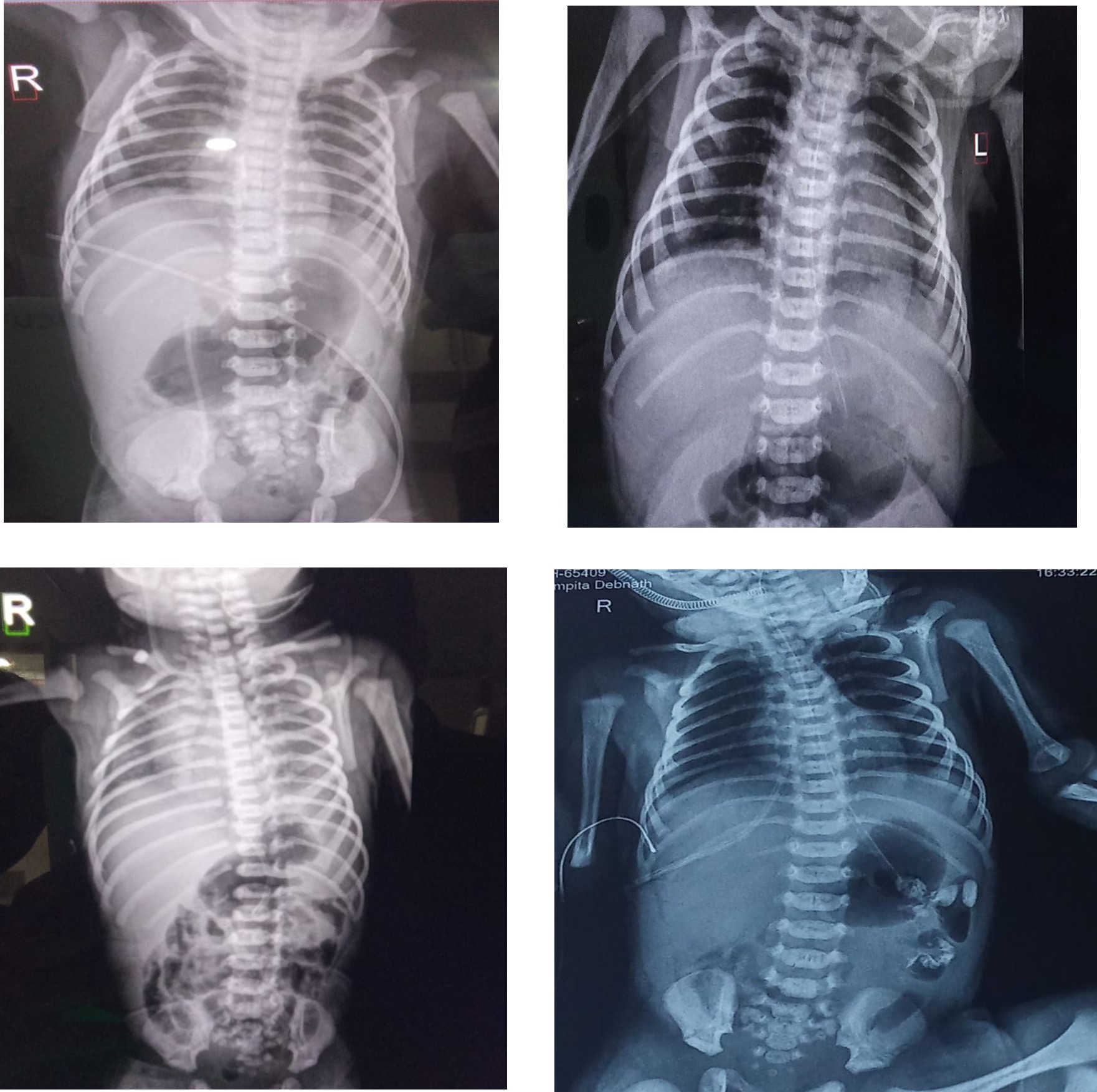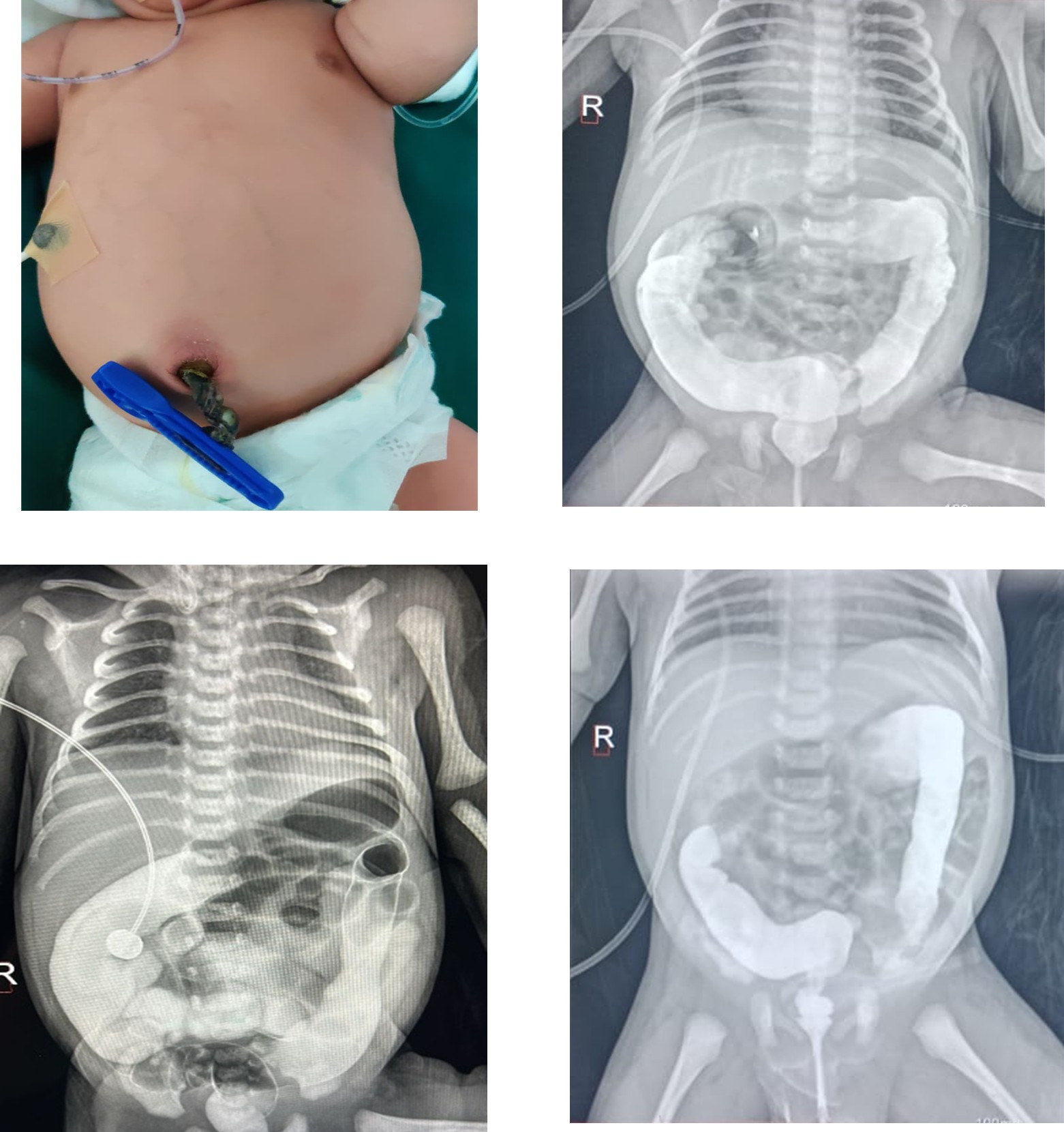As feeds advanced, the baby developed tachypnea and bile-stained gastric aspirates. From 30 hours, feeds were withheld (NPO). Sepsis markers were elevated (CRP 4.1 mg/dL) and antibiotics were escalated, but bilious aspirates persisted. Abdominal ultrasonography suggested malrotation, and a contrast study confirmed obstruction. On day 4 of life, emergency exploratory laparotomy was performed. Midgut malrotation was identified; de rotation and Ladd’s procedure were successfully completed. Postoperatively, the baby remained NPO for 3 days and received glucose infusion and amino acid nutrition. Enteral feeds were restarted on postoperative day 3 and advanced gradually to full feeds by day 12.