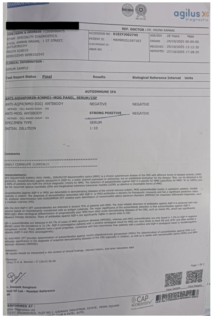 A patient presented with sudden, painful loss of vision and was diagnosed with optic neuritis. Initial management began at an outside hospital with intravenous Solu-Medrol pulse therapy for five days followed by tapering oral Wysolone. Confirmation of MOG antibody positivity established the diagnosis of MOGAD.