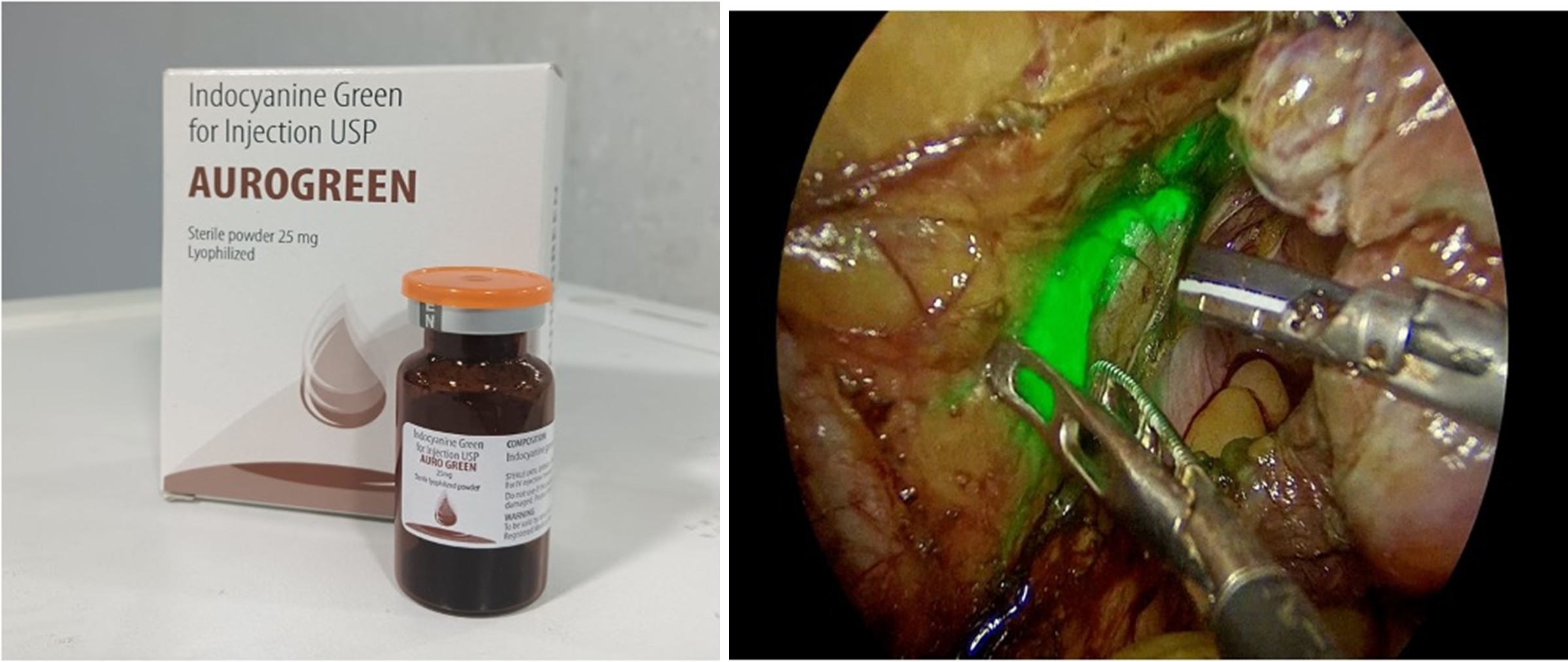 - After injecting the ICG dye using Karl strorz NIR imaging system, the fluorescent dye can be visualized to assess perfusion of the particular organ or in case of injection into the tissue the sentinel node of the particular organ can be visualized.