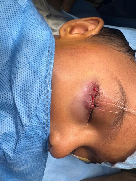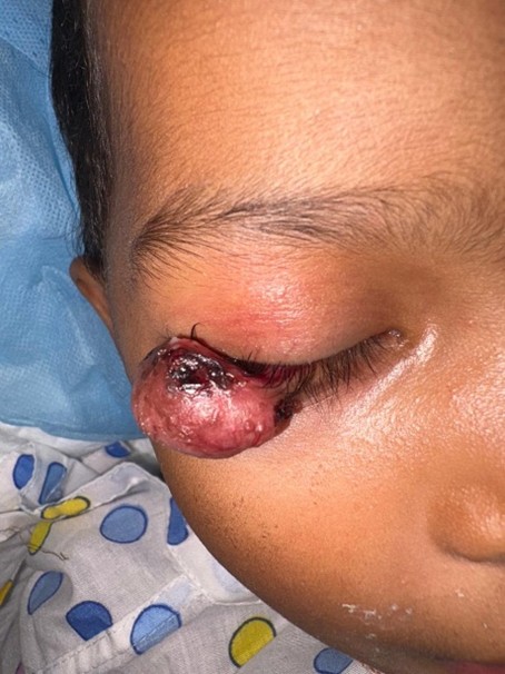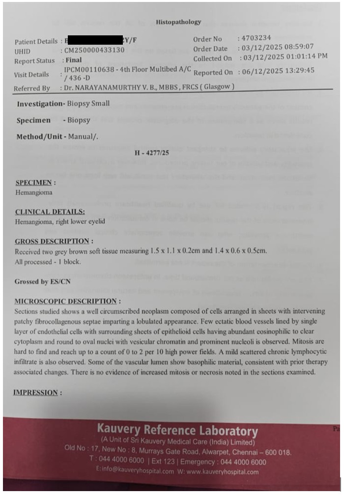 A 2-year-old female child was admitted to a tertiary care hospital for surgical management of a progressively enlarging reddish lesion over the right lower eyelid. The lesion was not present at birth and appeared at around 3 months of age, gradually increasing in size. The child had a history of intermittent bleeding following minor trauma. Prior medical management and intralesional steroid therapy had been attempted at another facility with limited response. The child was admitted for definitive surgical excision.