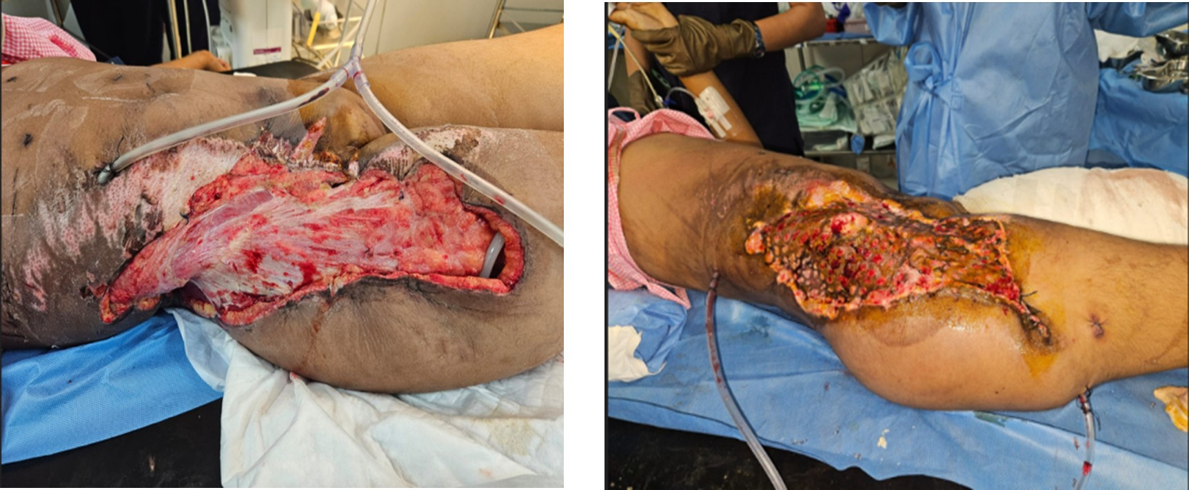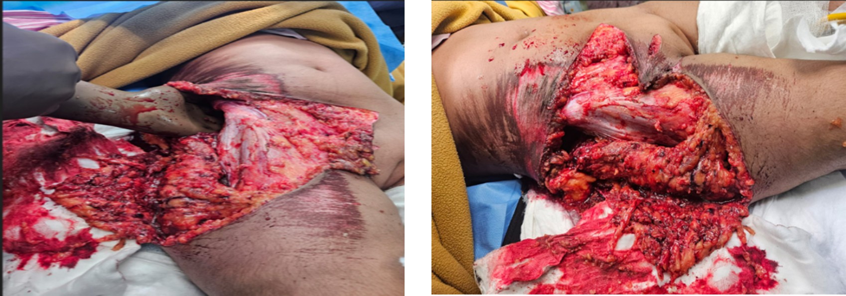 Findings: Raw area in Right iliac fossa, upper thigh and flank. Surrounding deglove of skin and soft tissue extending to upper thigh laterally and posteriorly. Degloving involving right gluteal region, lower back, lower chest on right side. There is further necrosis of degloved skin.