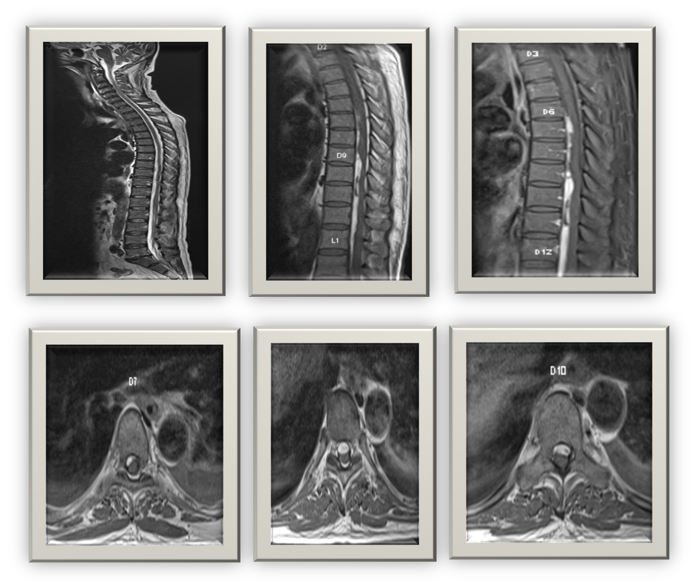 MRI Spine: Multiple cystic lesions in the thoracic and lumbar vertebrae with paravertebral and epidural extension, suggestive of infective spondylodiscitis.