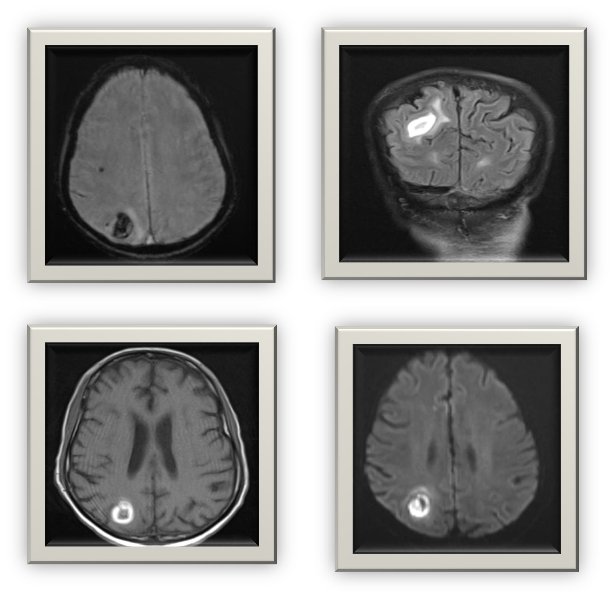 MRI Brain: Ring-enhancing lesion in the right frontoparietal region with surrounding edema consistent with cerebral abscess or meningoencephalitis.