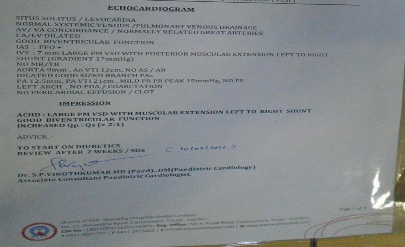 Diagnosis: Moderate sized peri membranous VSD
